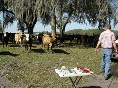 This is the home herd pen. Instead of being in a smaller pen we are on the outside which means the mamas can come up really close while we are working. It can sometimes be kind of scary because these mamas are trying to get to their babies. Remi likes to help us keep the cows back and sometimes does a good job…but other times he retreats and ends up either between our legs or under our table…with a cow on his heels. So this time we had to tie him in the truck. He was still on the job and let us know if they were getting too close. It really keeps me on my toes watching out for the mamas and watching as the calves come out of the chute hoping they don’t come straight at me or my organized table. Adam keeps telling me to be still and quiet…that is so hard for me…I always want to holler HEY! HEY! HEY! and dance out of their way. I am working on the still and quiet thing…needs lots more work. :)